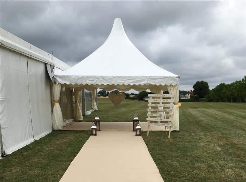 Covered walkways and entrances structures offer a stylish and practical way to welcome guests into your marquee. Not only do they provide shelter from the elements, but they also create a striking first impression. For a grand wedding marquee, a Chinese-style arrival pagoda adds an elegant and memorable touch to the overall setting.